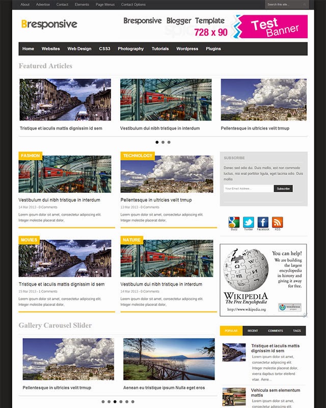 Description: Bresponsive template is a responsive template that features a high a level of SEO optimization, Magazine styled HomePage, Advertisements supported in header and Sidebar (Adsense supported) and Featured Carousel slider Top that is automatically updated. With Bresponsive, you don’t need a mobile template, as it is displayed properly on high end mobile devices.